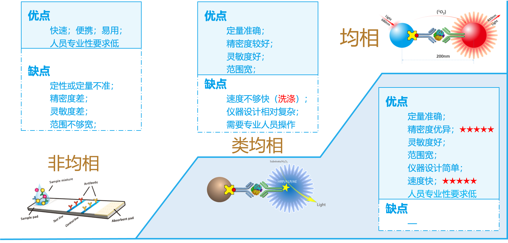第五代:均相化學發(fā)光法POCT,徹底免洗,具有優(yōu)良的精密度,結(jié)果可媲美大型化學發(fā)光系統(tǒng)。
