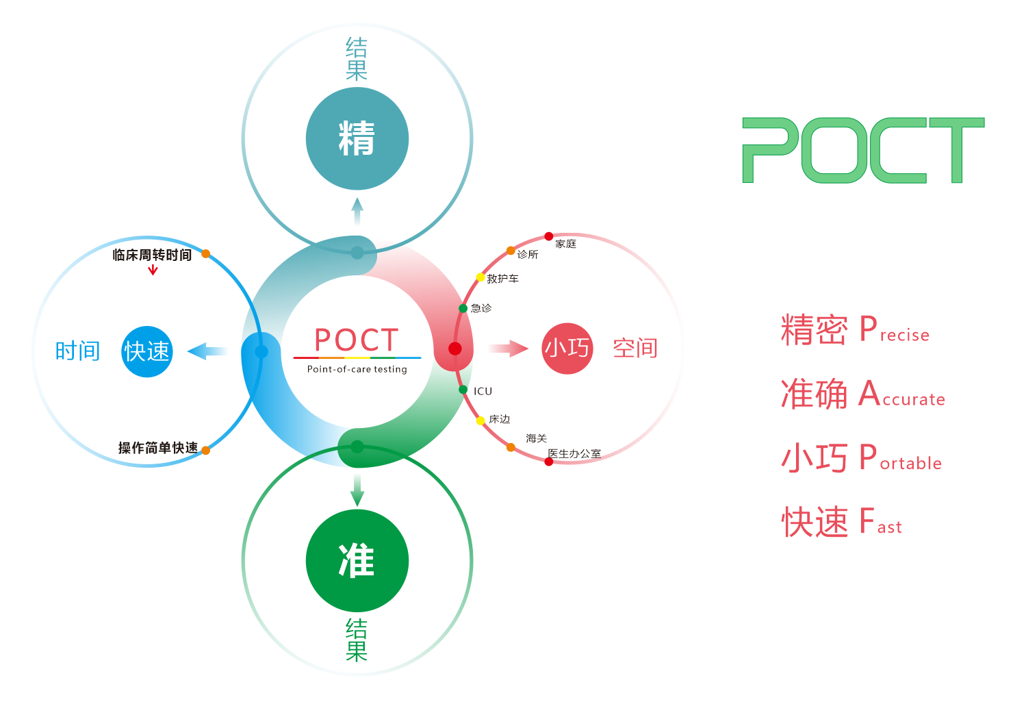 傳統(tǒng)POCT從兩方面進行定義:時間上——快速,達到“即時檢驗”;空間上——便攜,占地少,能在患者身邊進行檢測。